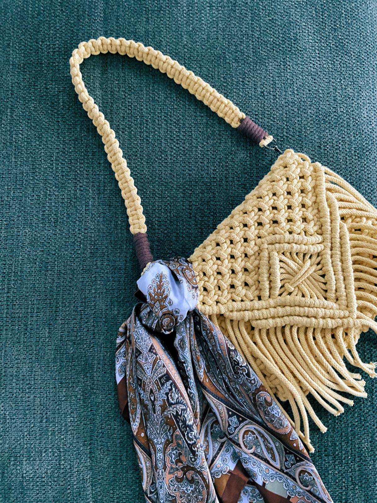 In diesem fortgeschrittenen Makramee-Workshop knüpfen wir gemeinsam eine Umhängetasche (s. zweites Bild).